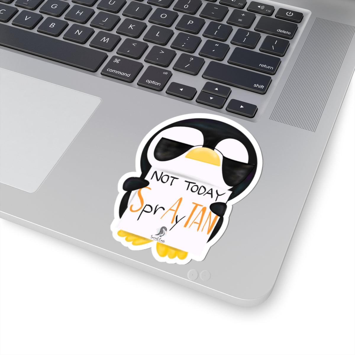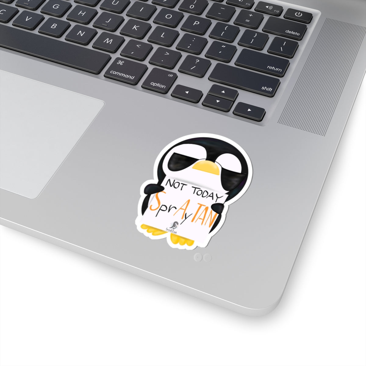 A cheeky, glossy vinyl sticker featuring a sunglasses-wearing penguin holding a handwritten sign that reads “Not Today SprAY TAN.” Playful and bold, this sticker brings a wink of attitude to laptops, journals, water bottle decals, and more. The vibrant eco-solvent inks make the black-and-white penguin and pops of orange stand out, while the permanent acrylic adhesive keeps it firmly in place on smooth, flat surfaces. Lightweight and easy to apply bubble-free, it adds instant personality to everyday items and speaks to people who prefer dry humor over suntan sprays. Choose from white or transparent backing and four sizes to suit your space and style.