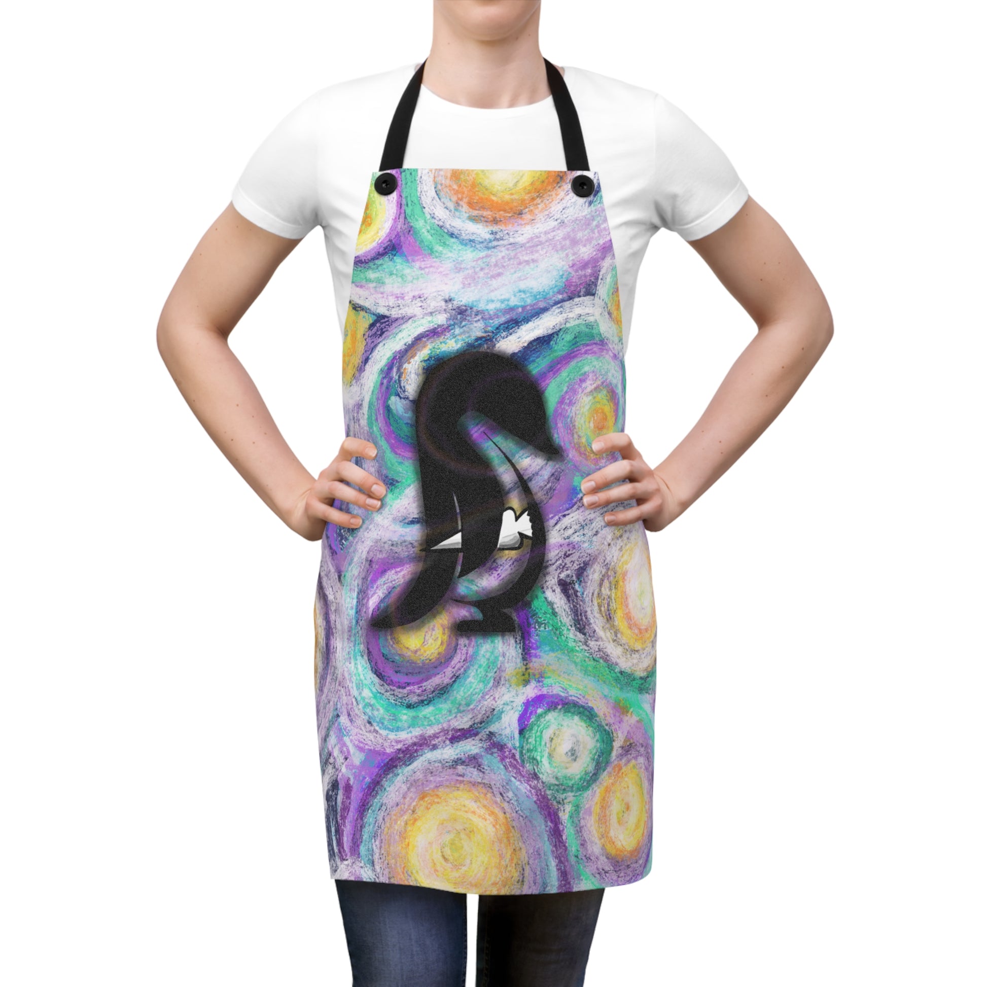 Bring color and movement to your kitchen with this artist-made apron. The vibrant swirling background—soft purples, teal greens, and warm golds—feels like paint-stroked starlight. A bold black silhouette motif anchors the design, giving the piece personality and contrast. Lightweight and quick-drying, the apron moves with you while you cook, bake, garden, or craft. The detachable black twill straps and four buttonholes let you adjust the fit and swap straps if you want a different look. Overlocked seams and durable polyester mean it stands up to frequent wear and washing, keeping the artwork bright for many sessions of making and hosting. This apron suits anyone who cooks with creativity and wants their workspace to feel playful and inspired—especially during cozy gatherings, holiday baking afternoons, or relaxed weekend brunches.